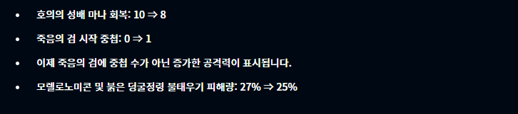 호의의 성배와 모렐로노미콘, 레드(붉은 덩굴정령)가 너프를 받고, 죽음의 검의 경우 버프를 받았습니다.