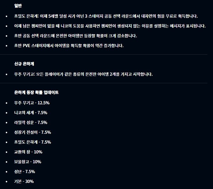 신규 은하계는 우주 무기고 은하계로, 모든 플레이어가 같은 종류의 완성템 2개를 가지고 시작한다고 합니다.