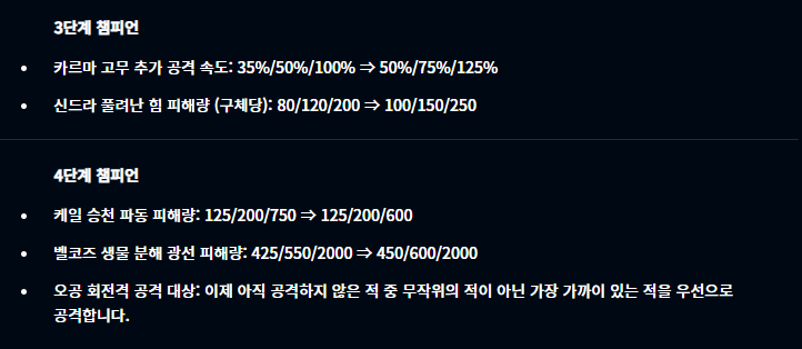 3코스트 챔피언 중에서는 카르마의 스킬이 버프를, 신드라의 구체 피해량이 증가하였습니다.