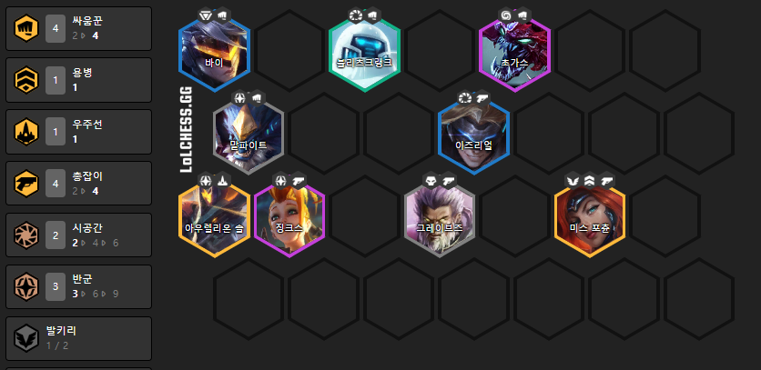 기준은 보통 2성이 된 챔피언들을 우선적으로 집어넣지만 2시공간 시너지를 위해 이즈리얼을 넣는 것을 선호합니다.