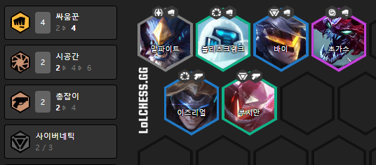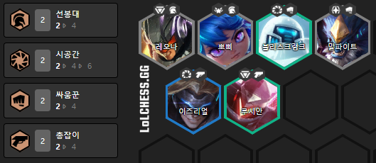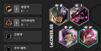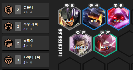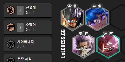 또, 만약 사이버네틱이 잘 나오고 그레이브즈가 나왔다면 3사이버네틱(피오라, 레오나, 루시안)과 2총잡이(그레이브즈, 루시안)을 활용하여 연승을 달릴 수 있습니다.